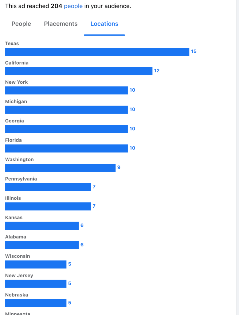 My post reached 204 people which I thought was pretty good considering I only spend $5 on this post. I don’t know if I had any expectations going into this but I would say this amount at least met them if not exceeded them. I included a screengrab of the locations it reached because this surprised me. I did not expect Texas to be first or California to be second just because I assumed this post would be shown to people geographically close to me first, so I was pleasantly surprised to see the geographic reach it achieved.